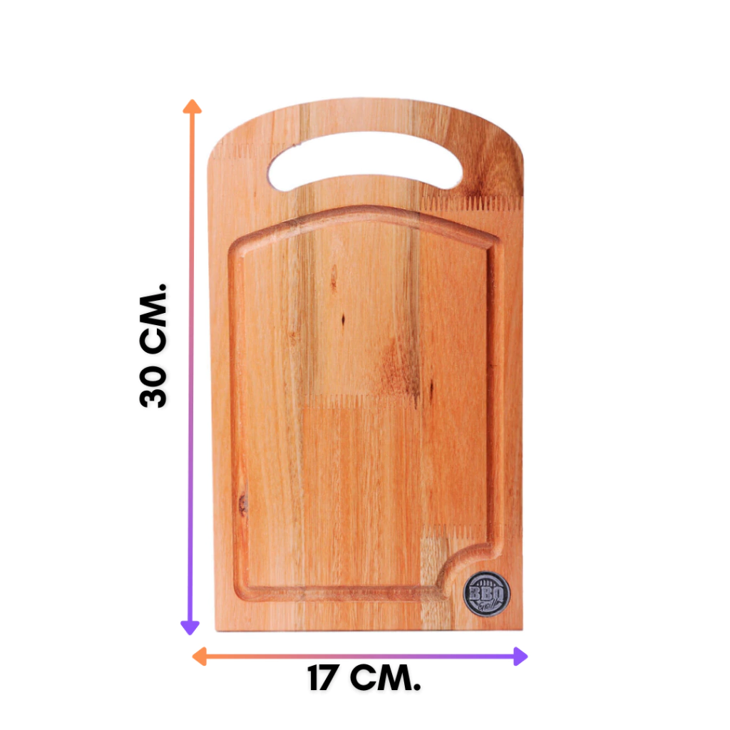 Compacta y cómoda, perfecta para cortar o servir alimentos con estilo. Su diseño incluye canaleta para jugos y asa curva ergonómica que facilita el agarre. Ideal para uso diario en la cocina o en la mesa como presentación individual.